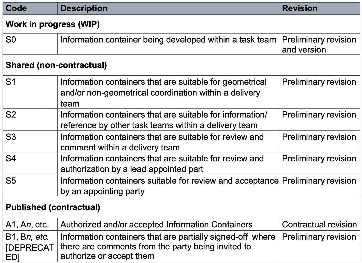 Example development of an information container through the revision metadata, in accordance with BS EN ISO 19650-2. Source: IMI Framework ISO 19650 Guidance C: Facilitating the CDE Workflow and Technical Solutions